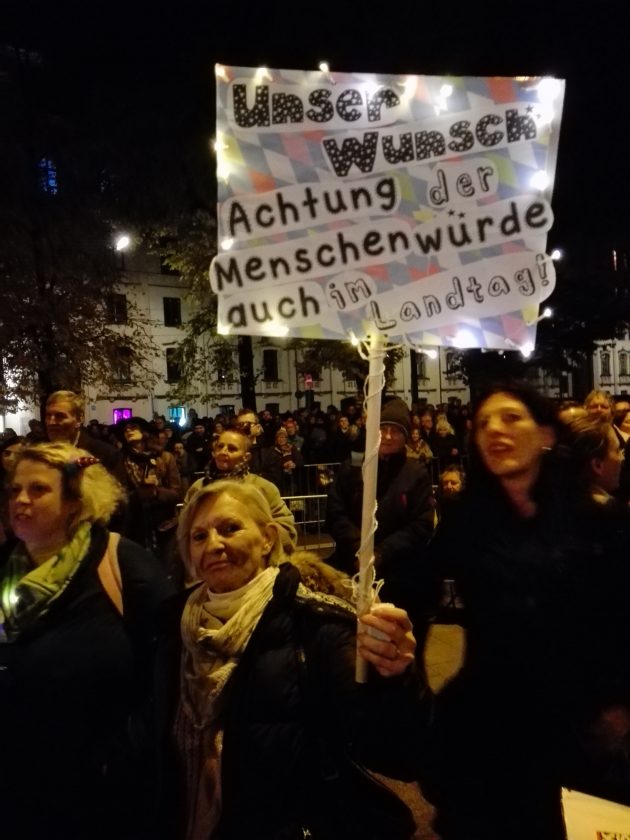 A Monaco di Baviera lunedì 5 novembre è il giorno in cui, per la prima volta, il partito populista di estrema destra Alternative für Deutschland (Afd) entra nel parlamento locale, dopo le elezioni dello scorso 14 ottobre. La sera, dalle 19 alle 22, una folla si raduna in strada davanti all’edificio del Maximilianeum, sede del Landtag, per protestare. L’Afd, che si è aggiudicata ventidue neo-parlamentari, ha basato la propria campagna elettorale sulla paura dell’immigrazione e di un’Europa islamizzata. Non è una novità, ma non è cosa da poco se si pensa alla storia della città. Quella Monaco che fu la culla del partito nazista di Hitler. La manifestazione, non a caso, si chiama “Attenzione agli inizi – manifestazione per la democrazia, la libertà e i diritti umani”. Sul palco si alternano musica e discorsi contro il razzismo.