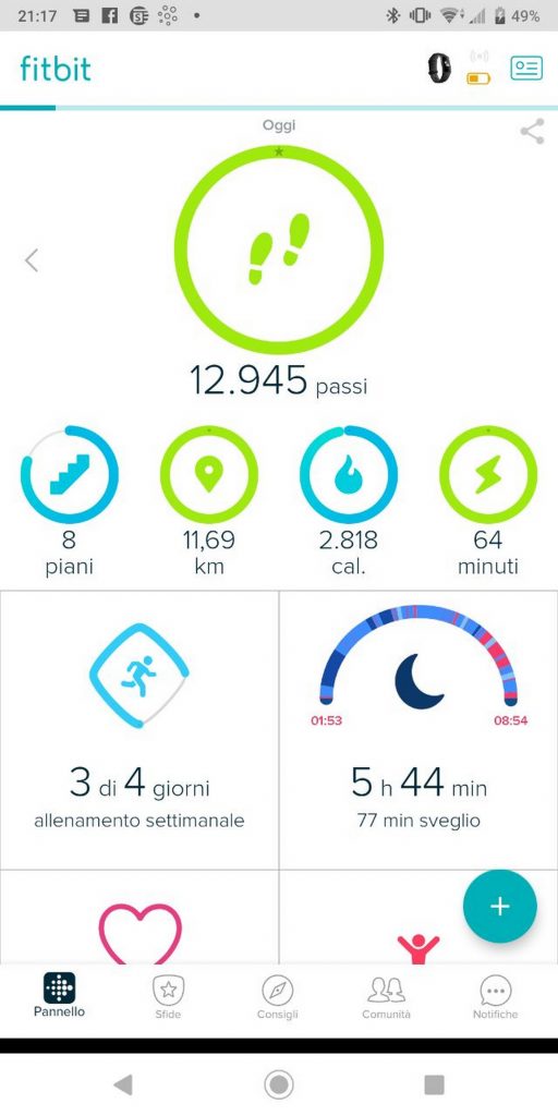 Sullo smartphone invece dovrete installare la classica app Fitbit (che avete già se usate altri dispositivi della stessa azienda). Serve per sincronizzare i dati, consultare le informazioni raccolte dal braccialetto, fornendo un numero maggiore di dettagli rispetto a quelli presenti sul tracker. Potete inoltre monitorare la vostra alimentazione, i cicli mestruali, personalizzare il quadrante e gestire le notifiche.