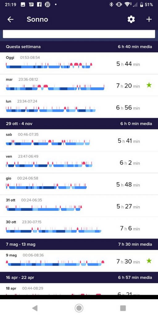 Funzionano molto bene invece il rilevamento delle scale, e quello dell’attività: se vi mettete a correre senza avere selezionato questa attività, il Charge 3 se ne accorge e registra la corsa. L’affidabilità si ritrova anche nel rilevamento del sonno. Monitora il sonno leggero, quello profondo e la fase REM, oltre a segnalare tutti gli intervalli in cui ci svegliamo.