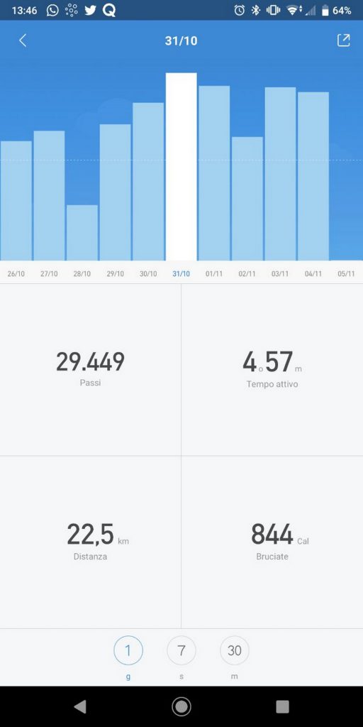Chiudiamo con le osservazioni sul software, che è semplice e intuitivo. Il display si attiva quando ruotate il polso, oppure quando toccate lo schermo. Con un movimento verso il basso accedete alle notifiche, che potete solo leggere. Con un movimento verso l’alto leggerete la sintesi dell’attività quotidiana, con passi, minuti di attività, frequenza cardiaca, distanza percorsa e calorie bruciate.