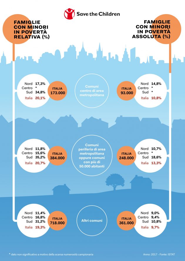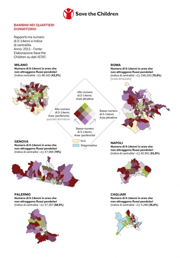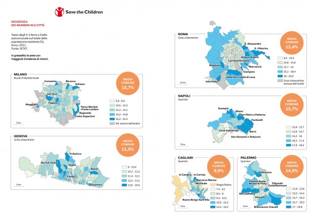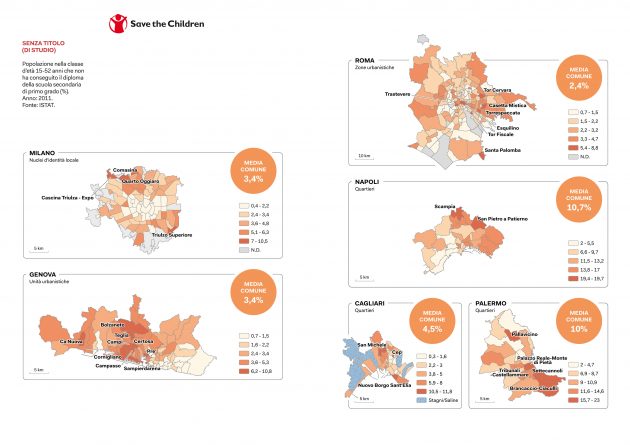 Pochi chilometri di distanza, tra una zona e l’altra, possono significare riscatto sociale o, al contrario, impossibilità di uscire dal circolo vizioso della povertà nel Paese dove 1,2 milioni di bambini e adolescenti vivono in povertà assoluta. In Italia la segregazione educativa allarga sempre di più la forbice delle disuguaglianze, in particolare nelle grandi città, dove vivono tantissimi bambini. Così a Napoli, le persone tra i 15 e i 52 anni senza diploma di scuola secondaria di primo grado sono il 2% al Vomero e quasi il 20% a Scampia, a Palermo il 2,3% a Malaspina-Palagonia e il 23% a Palazzo Reale-Monte di Pietà, mentre nei quartieri benestanti a nord di Roma i laureati (più del 42%) sono quattro volte quelli delle periferie esterne o prossime al grande raccordo anulare nelle aree a est della città (meno del 10%).