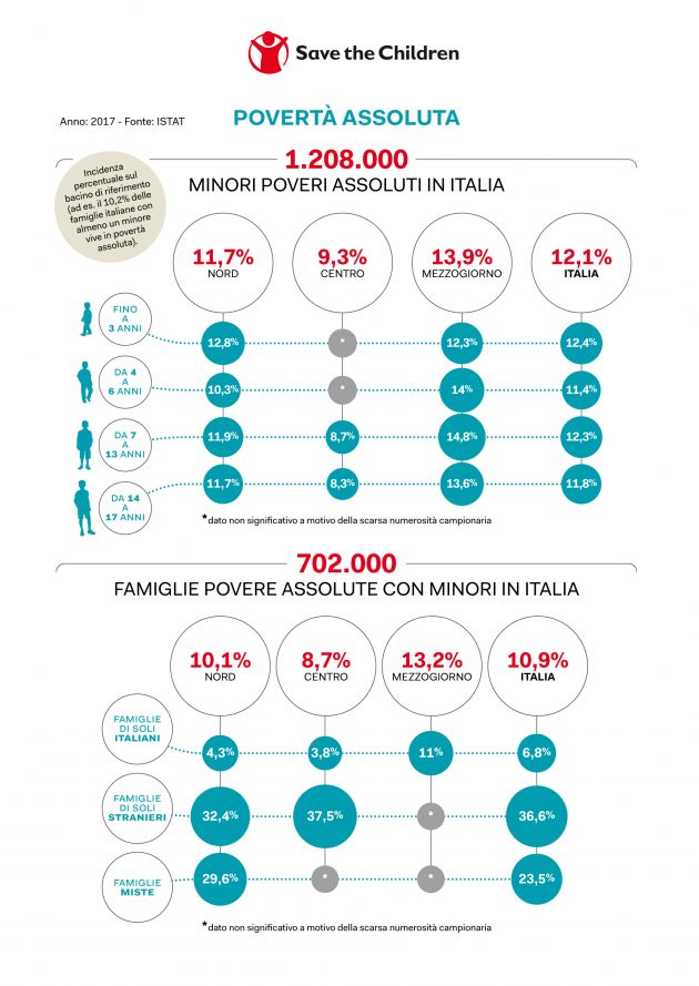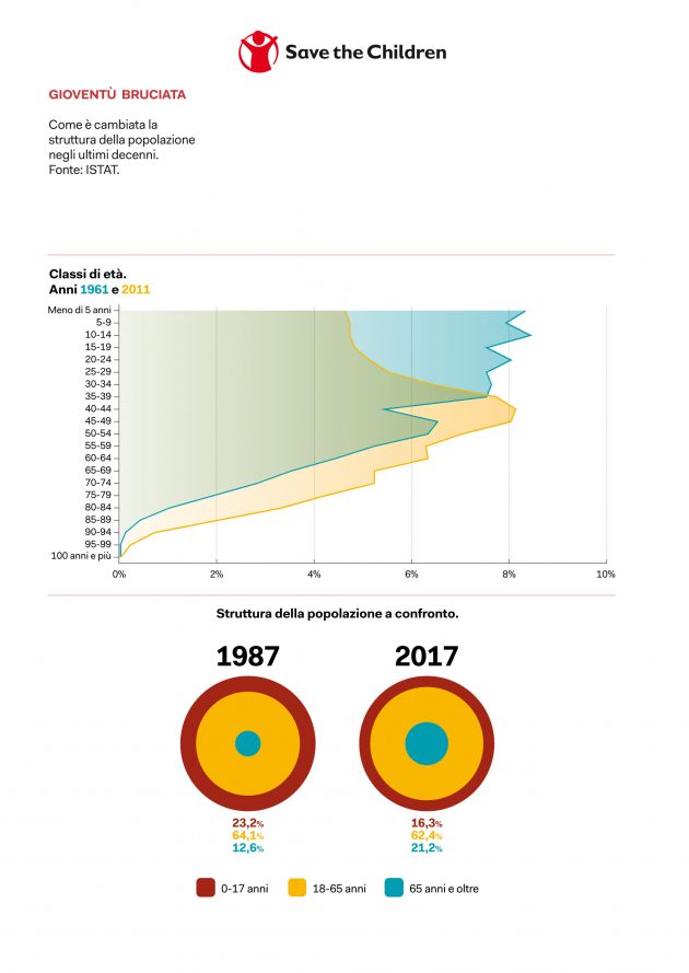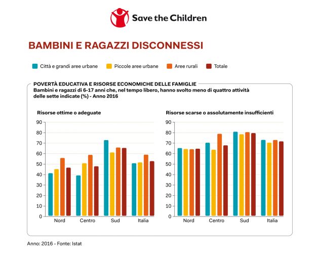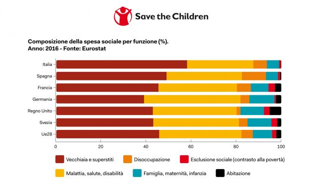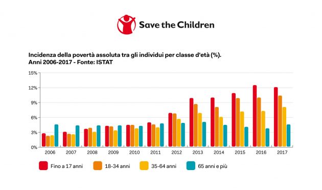 SAVE THE CHILDREN: “L’INFANZIA È LA PERIFERIA D’ITALIA” – Ad oggi, invece, i bambini e gli adolescenti sono sempre più ai margini della popolazione in termini demografici: nel 1987 erano il 23,2% del totale e oggi superano di poco il 16%, a fronte degli over65 che sono cresciuti dal 12,6% al 21,2%. Minori che si ritrovano anche ai margini dello spazio pubblico, se è vero che 94 bambini su 100 tra i 3 e i 10 anni non hanno modo di giocare in strada, solo uno su 4 trova ospitalità nei cortili e poco più di uno su tre ha la fortuna di avere un parco o un giardino vicino a casa dove poter giocare. “Ai margini della politica – sottolinea Save the children – per effetto di una spesa pubblica che negli anni della crisi economica, pur crescendo in termini assoluti, ha tagliato la voce istruzione e università dal 4,6% sul Pil del 2009 al 3,9% del 2015-16, mentre altri Paesi europei rispondevano alle difficoltà di budget in maniera diametralmente opposta aumentando questa voce di investimento fino al 5% del Pil”. Una forbice in negativo con l’Europa che si riscontra anche sui fondi per ‘famiglia e minori’ fermi in Italia al 5,4% della spesa sociale, contro l’11% di Germania, Regno Unito e Svezia e ben al di sotto della media UE attestata all’8,5%. La verità è che i minori in Italia sono sempre di più ai margini della ricchezza, se si considera che la povertà assoluta riguarda il 12,1% di loro, non fa distinzioni tra bambini e adolescenti (12,4% fino a 3 anni, 11,4% da 4 a 6 anni, 12,3% 7-13 e 11,8%14-17) e pesa sul quotidiano di 702mila famiglie con minori (10,9%). La povertà relativa, invece, riguarda un minore su 5. A conferma di un trend negativo, chi ha oggi meno di 17 anni ha una probabilità di diventare povero cinque volte più alta rispetto ai propri nonni.