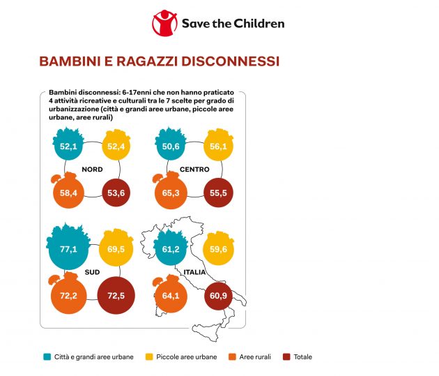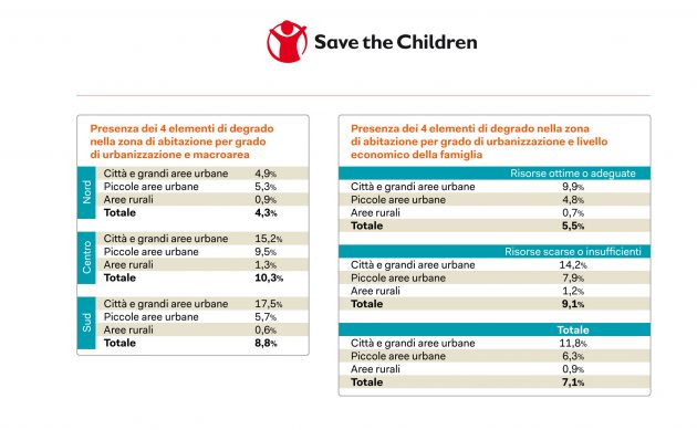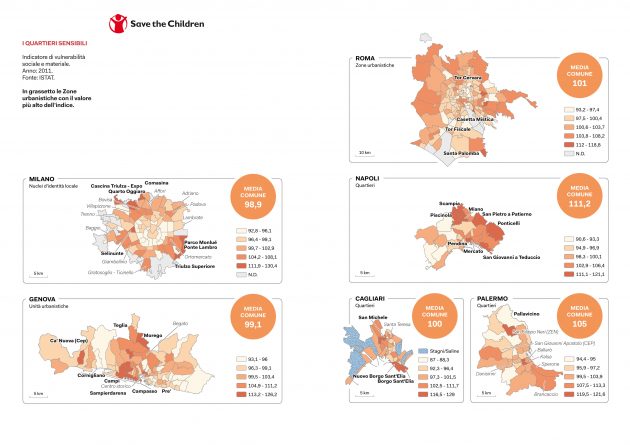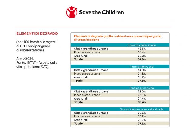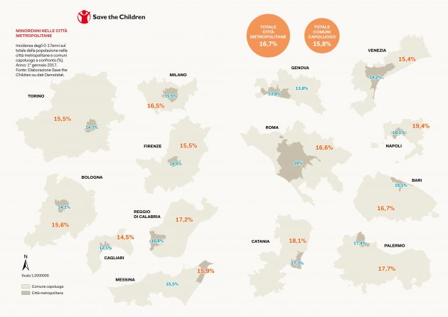 LA MAPPA DELLE PERIFERIE – Il IX Atlante dell’infanzia a rischio Le periferie dei bambini traccia una mappa dei divari che in termini di risorse economiche e culturali, accessibilità dell’istruzione e dei servizi, qualità degli spazi urbani, verdi, ricreativi espongono maggiormente bambini e adolescenti al rischio di vulnerabilità, “ma dimostra al tempo stesso – spiega Save the Children – come essi siano la risorsa più vitale e il potenziale più alto su cui puntare per innescare una indispensabile rigenerazione di questi luoghi”. Si tratta di un primo tentativo di cartografare le periferie italiane dal punto di vista dell’infanzia che attinge all’esperienza di Save the Children e di tante altre associazioni impegnate sul campo. Il volume di 290 pagine è curato da Giulio Cederna e corredato dagli scatti del fotografo Riccardo Venturi. “È assurdo che due bambini che vivono a un solo isolato di distanza possano trovarsi a crescere in due universi paralleli” commenta Valerio Neri, secondo cui “rimettere i bambini al centro significa andare a vedere realmente dove e come vivono e investire sulla ricchezza dei territori e sulle loro diversità, combattere gli squilibri sociali e le diseguaglianze, valorizzare le tante realtà positive che ogni giorno si impegnano per creare opportunità educative che suppliscono alla mancanza di servizi”.