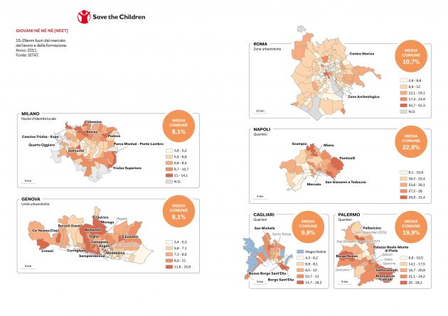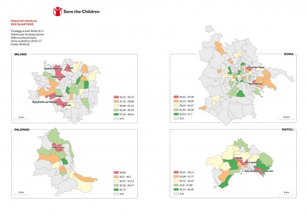 I DATI SUI NEET E IL DIVARIO NELL’APPRENDIMENTO SCOLASTICO – Differenze sostanziali tra una zona e l’altra di una stessa città riguardano anche i NEET, ovvero i ragazzi tra i 15 e i 29 anni che non studiano più, sono senza lavoro e non sono inseriti in alcun circuito di formazione: nel capoluogo lombardo, in zona Tortona, sono il 3,6%, meno di un terzo di quelli di Triulzo Superiore (14,1%), mentre a Genova sono 3,4% a Carignano e 15,9% a Ca Nuova, e a Roma 7,5% Palocco e 13,8% a Ostia Nord. Anche i dati tratti dai test INVALSI testimoniano il divario nell’apprendimento scolastico. A Napoli, ad esempio, una distanza siderale di 25 punti INVALSI divide i bambini dei quartieri più svantaggiati da quelli che abitano a Posillipo, a Palermo sono 21 quelli tra Pallavicino e Libertà, a Roma 17 tra Casal de’ Pazzi e Medaglie d’Oro, e a Milano 15 punti dividono Quarto Oggiaro da Magenta-San Vittore.