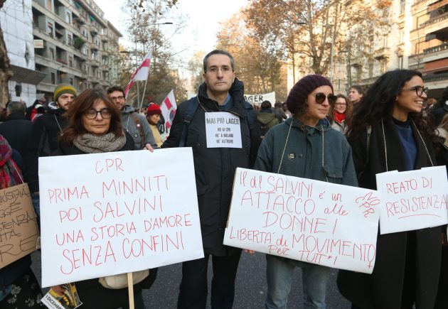Collettivi politici di sinistra e anarchici, sindacati di base, centri sociali, associazioni cattoliche e laiche che si occupano di accoglienza agli immigrati. Hanno sfilato più di 10mila persone per le strade di Milano per dire no al decreto Sicurezza e la chiusura del centro di accoglienza di via Corelli, destinato a essere trasformato in centro per il rimpatrio. Tanti gli slogan e i cartelli contro il vicepresidente del Consiglio e ministro dell’Interno, Matteo Salvini, che ha fortemente voluto il decreto, da “Mai più lager” a “Fermare Salvini”. Tanti anche gli striscioni, che recitavano: “Lega Salvini e lascialo legato” e “Lega ladrona. Salvini casta”.
