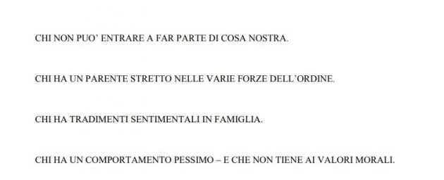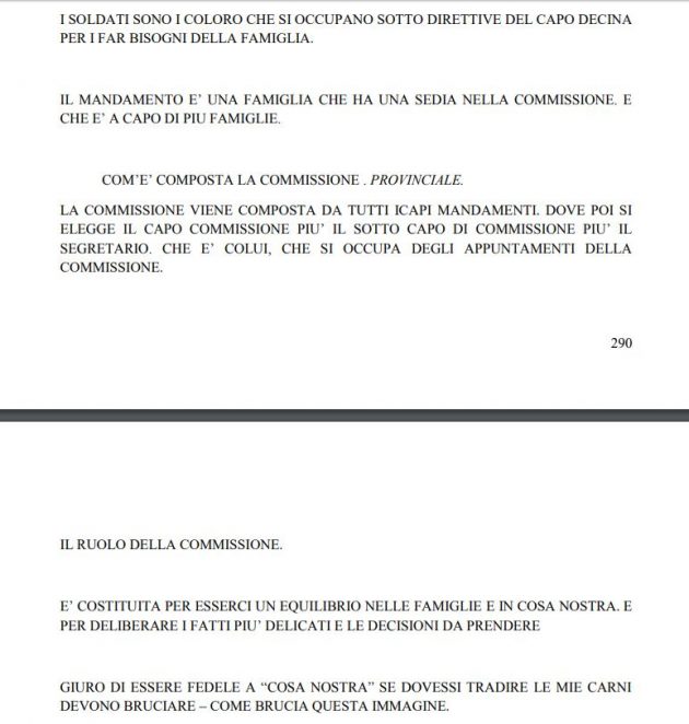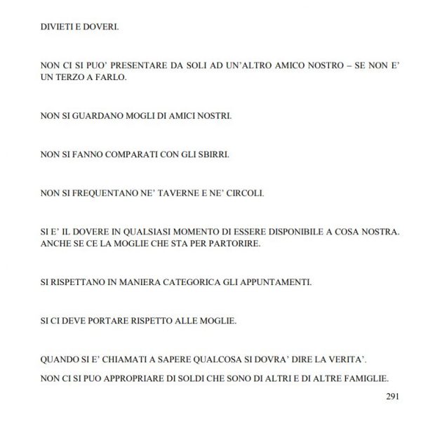 Il vademecum del perfetto mafioso – Sono due pagine che elencano da chi erano composti i mandamenti all’epoca – i Lo Piccolo vengono arrestati nel 2007 – e tutta una serie di precetti dei mafiosi. Si comincia dai componenti della famiglia, che sono il capo famiglia, il sottocapo, il consigliere, il capodecina e i soldati. “Il capo famiglia – spiega il pizzino dei Lo Piccolo – si elegge votando tutti i membri della famiglia. Così come per il consigliere. Il sottocapo viene chiamato dal capo famiglia. Così come pure il capo decina”. Poi si disciplinano le funzioni di ogni componente: “Il capo famiglia è colui che ci ha l’ultima parola. Il sottocapo fa le veci del capo famiglia in assenza del capo famiglia”. La commissione invece è “composta da tutti i capi mandamenti. Dove poi si elegge il capo commissione più il sotto capo di commissione più il segretario. Che è colui, che si occupa degli appuntamenti della commissione”. Sembra un organo parlamentare, è il parlamentino dei clan. Per i Lo Piccolo la commissione è “costituita per esserci un equilibrio nelle famiglie e in Cosa nostra. E per deliberare i fatti più delicati ha il ruolo di tenere a tutti uniti in famiglia e di dare consigli per il bene della famiglia. I soldati sono i coloro che si occupano sotto direttive del capo decina per i far bisogni della famiglia”. I boss che un decennio fa avevano in mano la piovra avevano anche stilato i “divieti e i doveri” dei mafiosi, ma nessun diritto. Sono tredici punti: “Non ci si può presentare da soli ad un altro amico nostro se non è un terzo a farlo. Non si guardano mogli di amici nostri. Non si fanno comparati con gli sbirri. Non si frequentano nè taverne e nè circoli. Si ha il dovere in qualsiasi momento di essere disponibile a Cosa nostra. Anche se ce la moglie che sta per partorire. Si rispettano in maniera categorica gli appuntamenti. Si deve portare rispetto alle moglie. Quando si è chiamati a sapere qualcosa si dovrà dire la verità. Non ci si puo appropriare di soldi che sono di altri e di altre famiglie”. Quindi c’erano tre regole finali che vietavano l’ingresso in Cosa nostra: “Chi ha un parente stretto nelle varie forze dell’ordine. Chi ha tradimenti sentimentali in famiglia. Chi ha un comportamento pessimo e che non tiene ai valori morali”.