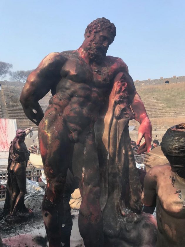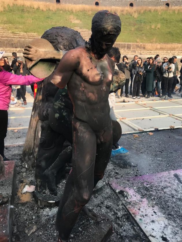 A Pompei invece le proteste sindacali sono state più pirotecniche dei fuochi, rischiavano di far saltare la madre di tutte le performance. Braccio di ferro tra il Parco Archeologico e i “gilet jaunes” nostrani. Collezionisti d’arte da tutti il mondo con il fiato sospeso, alla fine con tre ore di ritardo, Cai accende la prima miccia dal centro dell’arena. Per l’emozione inciampa e cade. Quando l’ultimo fuocherello si spegne rimangono statue di cartapesta mozzate, anfore frantumate. I pezzi di “reperti” archeologici sono in mostra al Maan fino al 20 maggio. Solo dopo saranno messi in vendita. Il clone dell’Ercole inceneritio varrebbe sui 350mila euro e c’è già la lista d’attesa per accaparrarselo. Alla cena di sfiziosità gourmet e placé organizzata dalla Fondazione Morra sotto la volta affrescata di Donna Regina c’era pure un defilatissimo archistar, Jean Nouvel, capello rasato e sguardo un po’ mefistofelico.