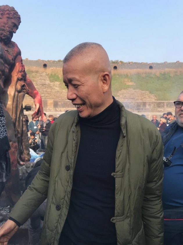 L’artista cinese dal nome impronunciabile Cai Guo-Qiang “incendia” l’anfiteatro di Pompei con fuochi d’artificio che simulano l’eruzione del Vesuvio. Il botto è tale che, seduta per terra in pole position, di fianco a me il curatore geniale francese Jerome Neutres, ci mettiamo la mano davanti alla bocca per non respirare la polvere da sparo, pulviscoli d’artista che vanno a “disegnare” le tele bianche disposte a mo’ di tappeti. Ogni dettaglio è studiato a regola d’arte da Cai che in Cina (non solo) è una arci/star e ha sparato fuochi grandiosi anche ai giochi olimpici a Pechino.