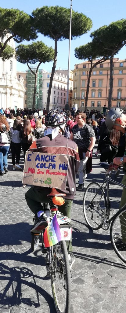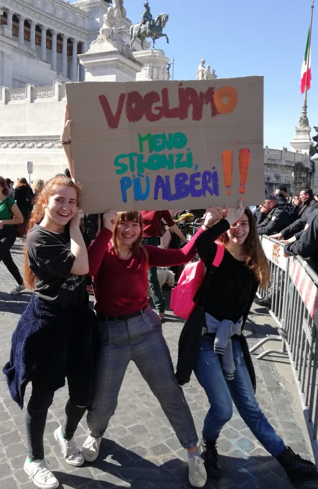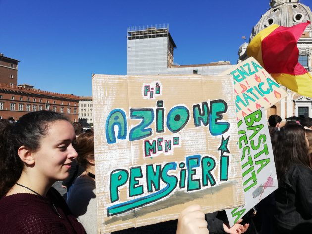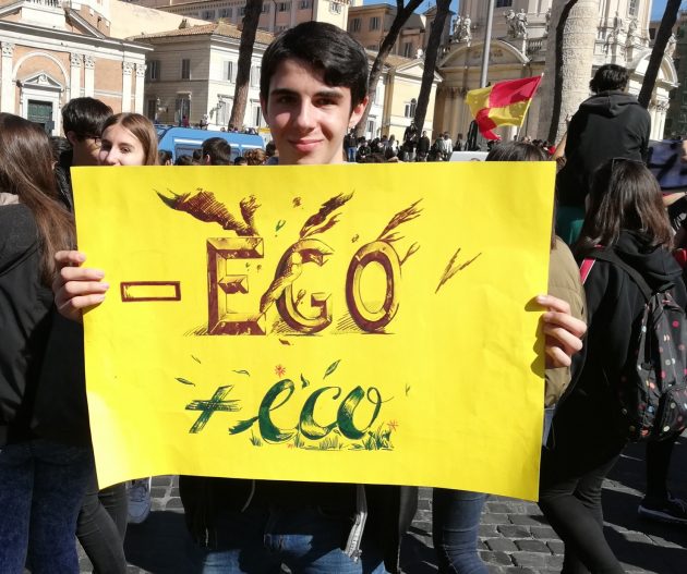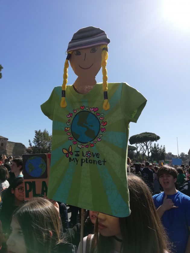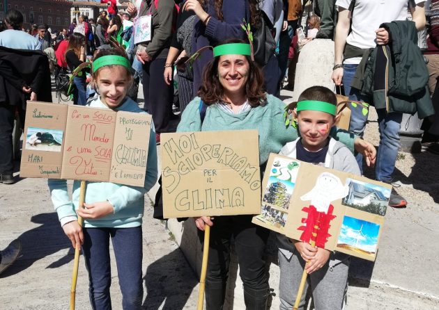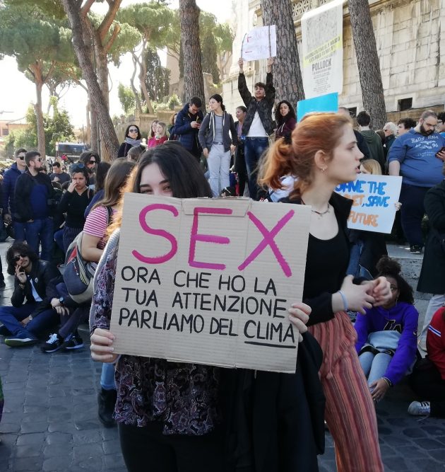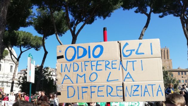 Fedeli alla raccomandazione di Greta Thumberg, tutti, grandi, piccoli, sono scesi in piazza con uno slogan sul clima. C’è chi lo scritto su un foglio, chi su un cartoncino, chi su un manifesto portato da più e più persone. Pochi, per la verità, gli slogan già visti, da “Non c’è un pianeta B” a “Ci siamo rotti i polmoni”-. Svettano, invece, sullo sfondo del Colosseo e di Palazzo Venezia, cartelli pieni di ironia: “Più erba e meno smog”, recita uno, in mano a dei ragazzi. “SEX. E ora che ho la tua attenzione, parliamo di clima”, ha scritto una ragazza che ride coprendosi il volto. E ancora: “Odio gli indifferenti, amo la differenziata”, “Le persone che pensano che il cambiamento non sia reale vivono troppo poco fuori dall’ufficio”, “Più azioni e meno pensieri”. “Non ci potremo mangiare il denaro”, “Meno Ego più Eco”, “Se non ora quando se non ora chi”. Un ciclista si è appesa un cartello con scritto: “È anche colpa mia ma sto rimediando”, mentre qualcuno ricorda che “Il cambiamento climatico comincia nel tuo piatto”. Alcuni ragazzi girano con slogan romani volgari ma divertenti e due ragazze, pure, sventolano un cartellone dove non la mandano a dire: “Vogliamo meno str. e più alberi”. Infine un’anziana signora, amante dei gatti, con una maschera da micio sul volto, mostra il suo cartello con dei gatti e su scritto: “Il pianeta è anche loro. Strike for future”. Ha ragione pure lei.