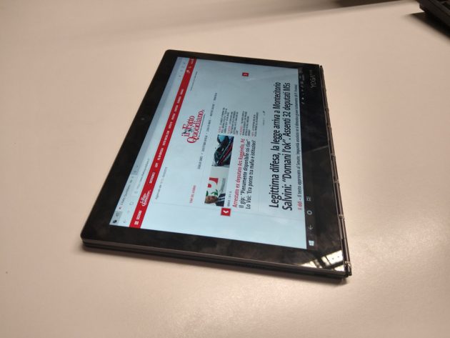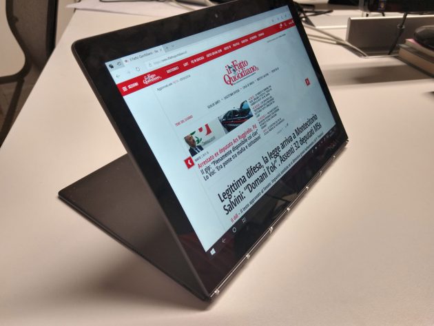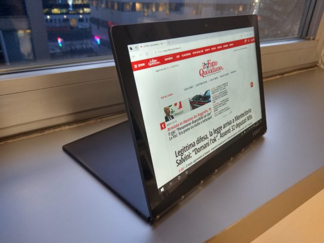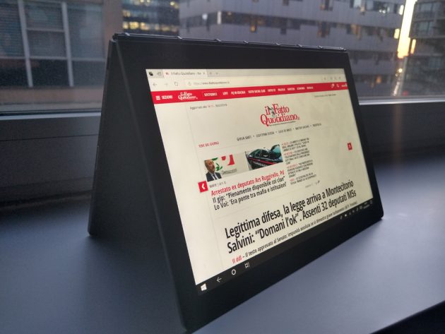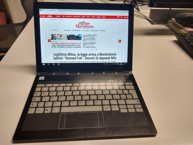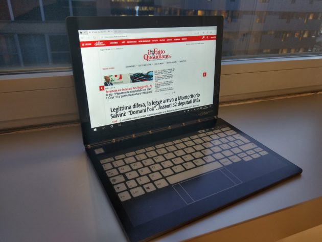 Grazie alle sue dimensioni compatte ed i soli 790g di peso, lo YogaBook c930 è abbastanza comodo da portare con se ogni giorno senza la necessità di utilizzare uno zaino o una borsa da PC, entra infatti comodamente anche in zainetti dalle dimensioni ridotte. Avendo a bordo Windows 10 si ha accesso ad un’esperienza simile a quella di un laptop tradizionale, a patto di non esagerare: entrambe le varianti di cpu disponibili – Intel m3-7Y30 ed i5-7Y54, quest’ultimo nel modello provato – sono pensate per operare con un ridotto consumo energetico (4,7W alla frequenza base), e di conseguenza sono meno potenti di quelle equipaggiate sui più comuni ultrabook e laptop, vedendo il device di Lenovo gestire perfettamente le operazioni da “pacchetto office”, la navigazione e la fruizione di contenuti multimediali, ma essere meno indicato per operare con la suite di Adobe oltre operazioni base (ma lo schermo da meno di 11″ dovrebbe già di per se scoraggiare).