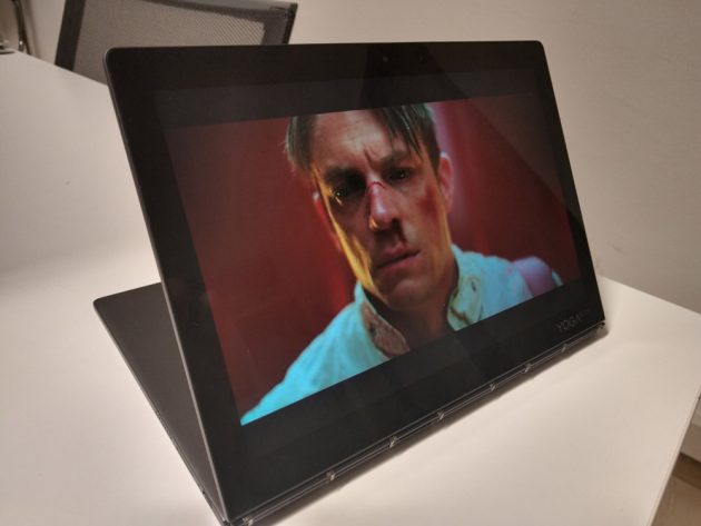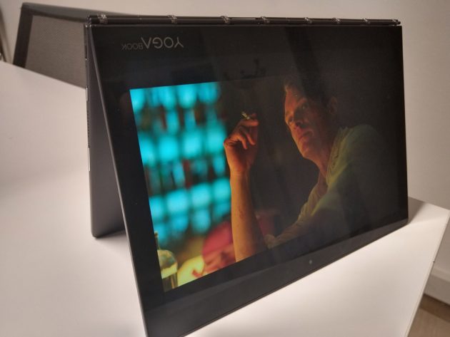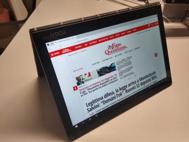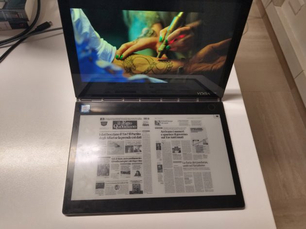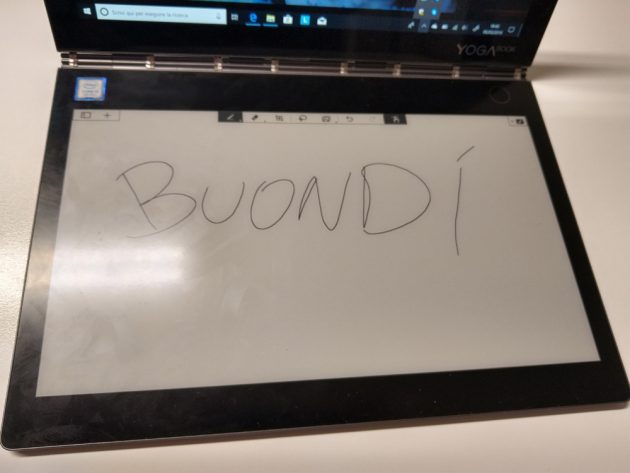 Lo schermo principale del 2-in-1 di Lenovo è di ottima fattura, presentando ottimi colori ed una buona definizione, brillando (insieme al doppio speaker DolbyAtmos) nella riproduzione di video. Lo schermo E-Ink invece si trova nella dura posizione di essere al contempo quel “qualcosa in più” e quello che fa storcere un po il naso nelle sue varie funzionalità: da “tavoletta grafica” generalmente comoda e abbastanza precisa sia con il pennino in dotazione (utilizzabile anche sullo schermo principale) che a mano, in questo caso bisogna cambiare la modalità tramite apposita iconcina, ha però in alcuni momenti sofferto di piccoli ritardi che posson far dubitare sulla ricezione del tratto (magari portando l’utilizzatore a fermarsi); nella modalità e-reader un po delude, buoni tempi di risposta nello sfogliamento, buona definizione delle pagine, ed interessante considerata la possibilità di richiudere lo YogaBook in modo da mantenerlo all’esterno, ma può al momento aprire esclusivamente file PDF -quindi esclusi gli epub, per cui il produttore promette il supporto nel corso dell’anno- e non offre funzionalità di highlighting.