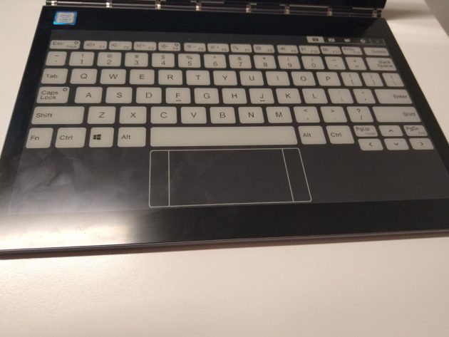 Quando usato come tastiera, lo schermo e-ink dello YogaBook c930 vede Lenovo cercare di fare un passo in avanti rispetto a quanto visto nell’originale YogaBook offrendo la possibilità di cambiare a piacimento layout (essendo disegnata a schermo si avrà sempre quello corretto), un sistema di animazione dei tasti per dare un feedback visivo oltre a quello tattile tramite vibrazioni, e due varianti di tastiera: una detta classica con tasti più compatti e area touchpad fissa, l’altra detta moderna riduce il touchpad ad un’area piccola quando non in uso offrendo tasti più ampi, e quando attivato lo vede estenderesi occupando l’area della barra spaziatrice. Nel corso della prova nonostante avessimo iniziato con la tastiera moderna ci siamo trovati presto ad optare per la “classica”, essendoci trovati a non poter usare la barra spaziatrice subito dopo il touchpad, rallentando i tempi di digitazione; una volta trovata l’opzione più comoda per noi l’esperienza di digitazione è stata buona – è stata utilizzata per redigere la review del Moto G7 Plus di qualche settimana fa- , dal punto di vista tattile non è molto diverso dal digitare sullo schermo dello smartphone, non facendo percepire in modo eccessivo l’assenza di una tastiera fisica.