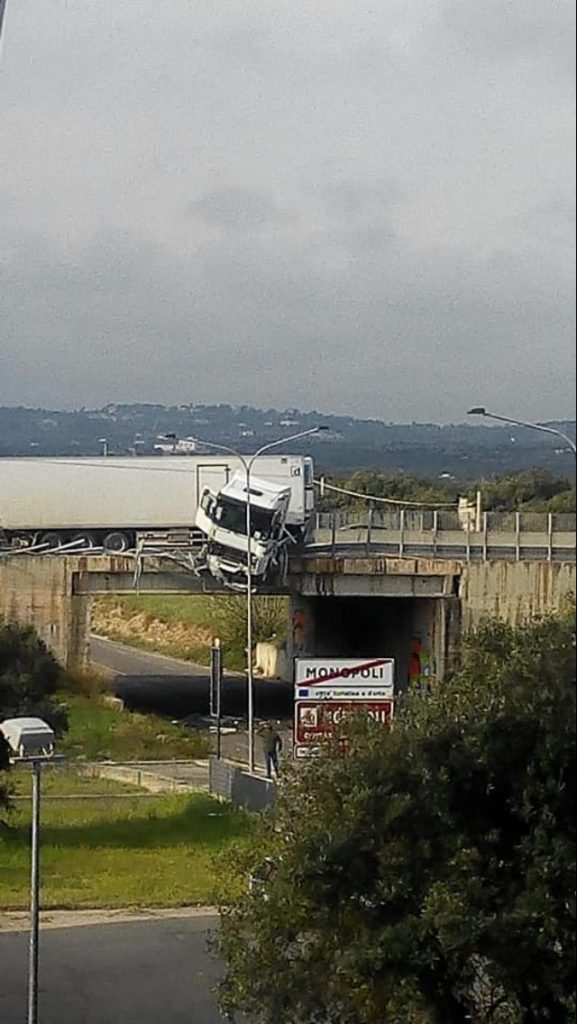 In bilico sul ciglio della strada, con la motrice penzolante nel vuoto: sotto il cavalcavia, una strada provinciale. E’ sotto shock l’autista di un tir uscito di strada su un ponte dello svincolo della statale Monopoli-Castellana Grotte, in provincia di Bari. Per motivi da chiarire il camion si è intraversato: il rimorchio
