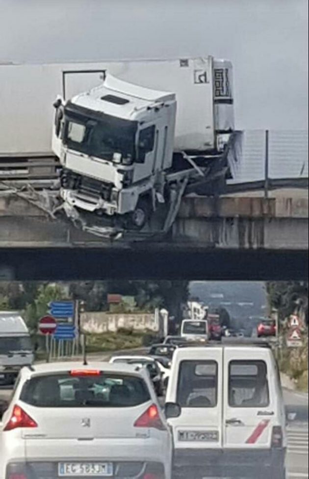 Monopoli, tir fuori strada: la motrice in bilico sul cavalcavia sulla provinciale