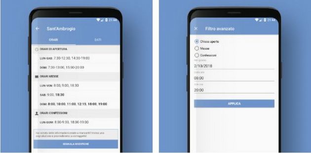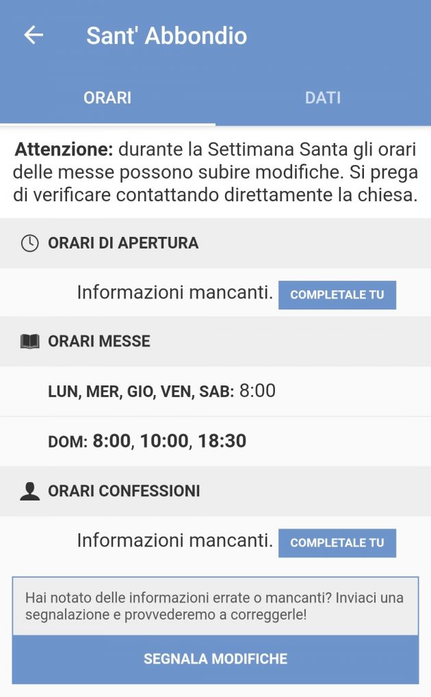 Una volta selezionata la zona, basta cliccare sui nomi delle chiese per accedere alla pagina di dettaglio di ciascuna, dove sono indicati gli orari di apertura e chiusura, quelli delle messe e quelli delle confessioni. In caso qualche informazione mancasse si può contribuire a completarla. I costanti aggiornamenti comprendono anche una sezione con testi di Papa Francesco sul significato della messa. Per chi preferisse, invece dell’app esiste anche una versione web che si può consultare con il browser.