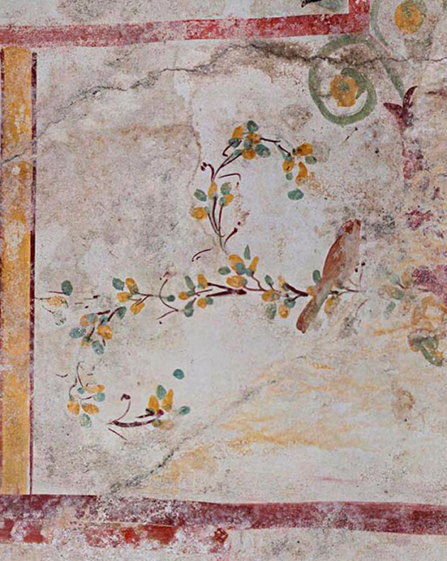 Il tutto è attraversato da motivi vegetali: esili ghirlande e cespi che terminano in foglioline e steli di colore verde, giallo e rosso, festoni e forse frutti, compongono un paesaggio surreale popolato da uccellini ritratti in diverse pose. Sulla lunetta di fondo della volta a botte, a destra della bocca di lupo, si staglia una tipica architettura immaginaria con le sue esili colonne su uno sfondo inesistente, sormontata da una patera d’oro (piatto cerimoniale) e da cui pende una mezza ghirlanda. Accanto, una muta e solitaria sfinge.