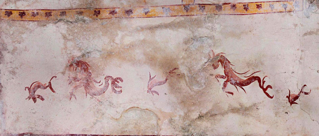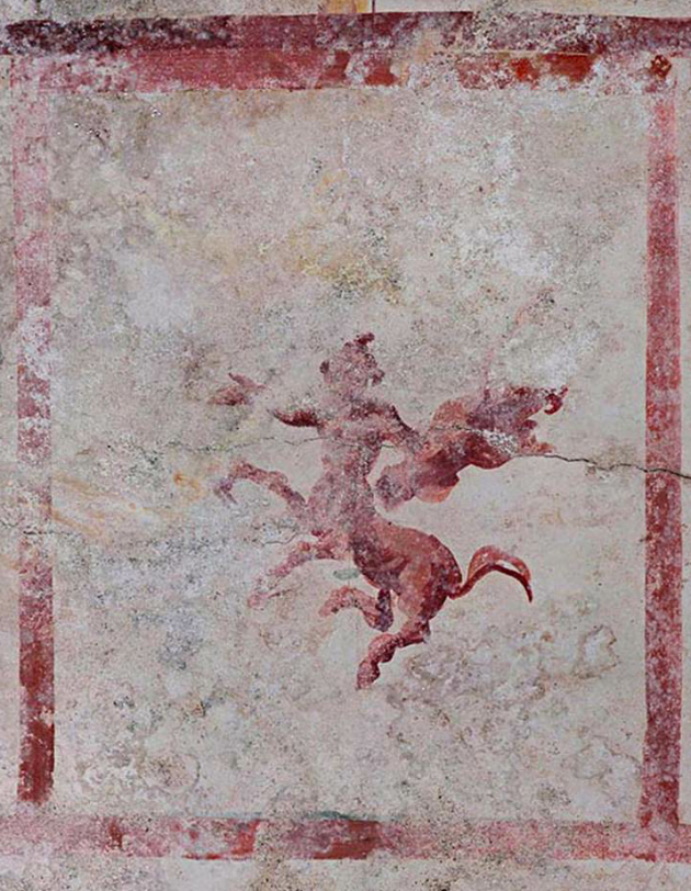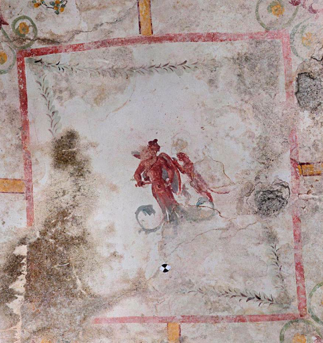 La decorazione pittorica della volta è ben visibile e discretamente conservata: sul fondo bianco della volta si vedono riquadri tracciati di rosso, contornati da linee di color giallo ocra, con fasce dorate punteggiate da una fitta serie di elementi vegetali. Animano i riquadri diverse figurine elegantemente dipinte con tratti di colore denso: una che nasce da un cespo vegetale, armata di spada, faretra e scudo, contro cui si erge una pantera; centauri rampanti e figure di Pan, uno con lituo (bastone ricurvo), un altro con oggetti, forse strumenti musicali, fra le mani. All’esterno del perimetro, si susseguono poi, quasi rincorrendosi, creature acquatiche stilizzate, reali o fantastiche.