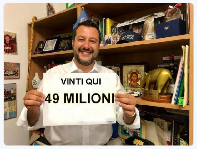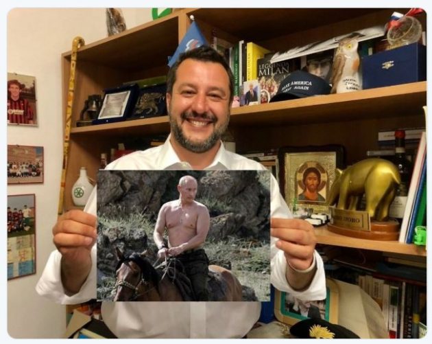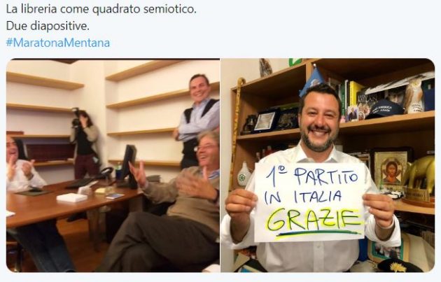 La foto in cui Matteo Salvini festeggia la vittoria, dove regge un cartello con scritto: “Primo partito in Italia. Grazie”, è già virale. Ovunque, sui social network, spuntano meme, foto e battute. Soprattutto, sul contenuto della libreria che fa da sfondo alla foto, tra una boccetta di acqua di Pontida, una foto di Putin e il cappellino di Trump.