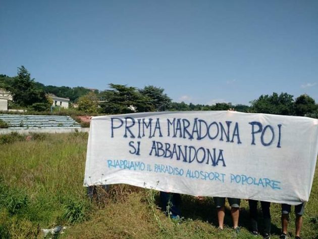 Trent’anni fa c’era la fila, fuori da quel cancello azzurro. Bambini sulle spalle dei papà con sciarpe e magliette da far autografare, rare le foto, e se qualcuno avesse parlato di selfie lo avrebbero guardato come un marziano. Tutti lì per Lui, per una foto o una firma, ma bastava anche solo guardarlo: in mezzo al campo c’era Maradona che, per la verità, godeva parecchio di quelle attenzioni e regalava palleggi con palloni improvvisati: dalle bottigliette d’acqua ai frutti alle palline da tennis. Oppure gol stratosferici nel sette, famosi quelli da dietro la linea di fondo. Trent’anni fa c’era Maradona in mezzo al campo del Centro Paradiso di Soccavo, periferia Ovest di Napoli: oggi c’è immondizia, nel campo e un po’ ovunque.