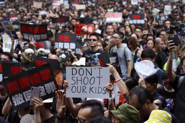 Gli attivisti si sono radunati  a Victoria Square vestiti di nero, con fiori bianchi in segno di lutto per il loro compagno morto sabato, con striscioni contro la Cina, accusata di “uccidere” i residenti di Hong Kong, o in cui si precisa che “gli studenti non incitano alla rivolta”, dopo che la governatrice mercoledì scorso aveva accusato i manifestanti di partecipare a una “rivolta organizzata“.