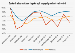 Inoltre, serve la credibilità costruita sulla base del rispetto degli impegni presi. Secondo l’ultimo Compliance report del G20, dal 2012 l’Italia ha imboccato un trend in discesa sugli impegni effettivamente rispettati (figura 2), che l’ha portata da un picco del 90 per cento a un minimo del 66 per cento, risultato che fa del nostro paese ultimo in questa classifica di credibilità.