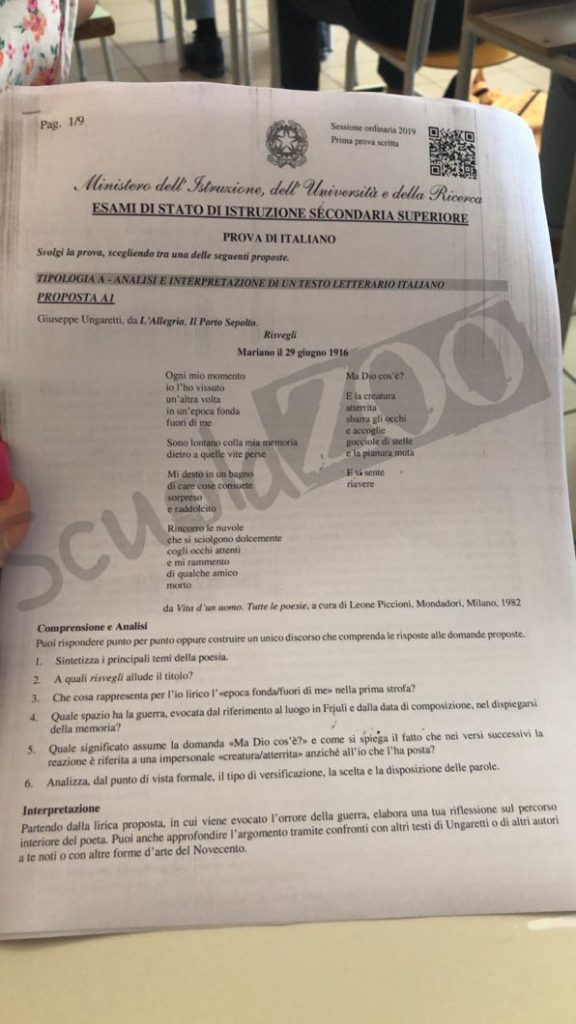 La prima traccia a uscire è, come tutti gli anni, quella dell’analisi del testo: tra gli autori scelti dal Miur per la prima prova della maturità – che quest’anno prevede in tutto sette tracce (leggi) – c’è “Risvegli” di Giuseppe Ungaretti, confluita nel 1942 nella raccolta L’allegria. Un autore che i maturandi, i primi del nuovo millennio a cimentarsi con l’esame di Stato, non vedevano comparire nel tema di italiano dal 2011. La seconda traccia proposta invece per la Tipologia A – che da quest’anno prevede la scelta tra due brani, uno di prosa e uno di poesia – è “Il giorno della civetta” di Leonardo Sciascia, che racconta la storia di alcuni omicidi commessi dalla mafia e della lotta del comandante dei Carabinieri Bellodi per scoprire la verità ed arrestare i colpevoli. Nel 1968 il regista Damiano Damiani ha tratto un film da questo romanzo.