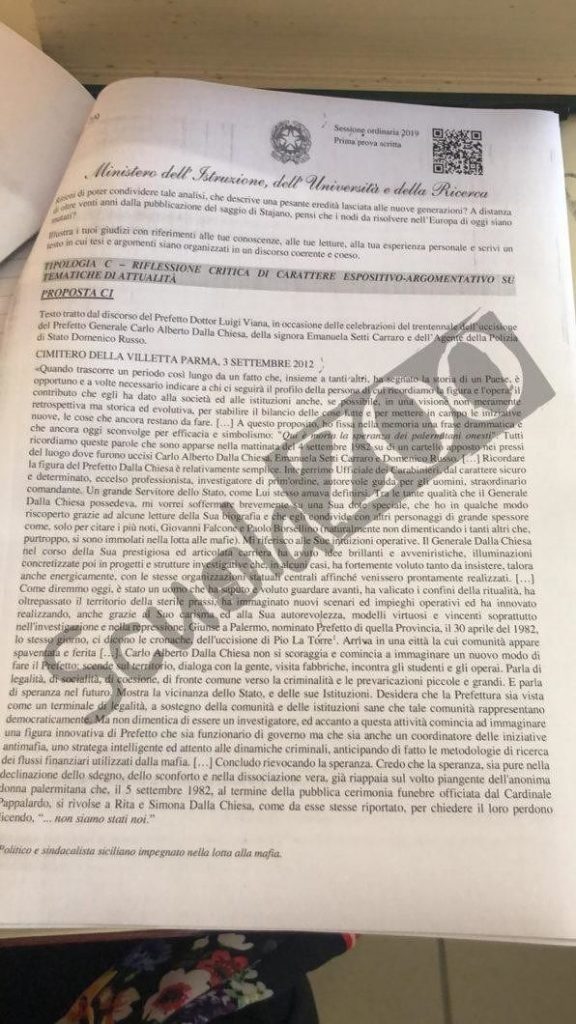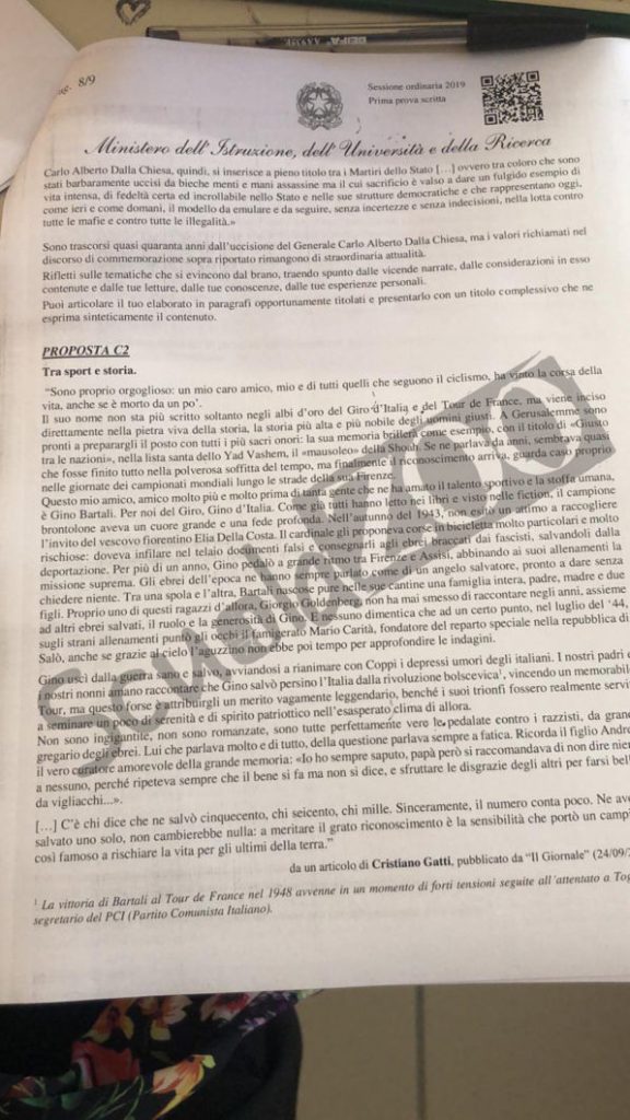 Per quanto riguarda invece le due tracce di attualità, quindi la tipologia C, la prima parte da un testo tratto dal discorso del prefetto Dottor Luigi Viana, in occasione delle celebrazioni del trentennale dall’uccisione del Prefetto Generale Carlo Alberto Dalla Chiesa, di Emanuela Setti Carraro e dell’agente Domenico Russo. La seconda invece, su sport e storia, parte dall’articolo del giornalista Cristiano Gatti pubblicato su Il Giornale, che parla della vittoria al Tour de France di Gino Bartali “giusto tra le nazioni” nel 1948, avvenuta in un momento di forte tensione dopo l’attentato a Togliatti e invita a interrogarsi sul Ruolo dello sport nella storia e nella società. E secondo quanto risulta a ScuolaZoo, sono queste due le tracce scelte dalla maggior parte degli studenti.