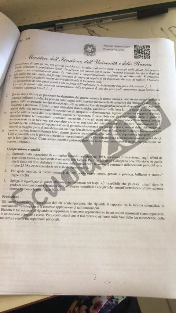 Passando invece alla tipologia B (tre tracce), c’è Corrado Stajano con “La cultura italiana del ‘900” in cui l’autore commenta le frasi di alcuni protagonisti del ventesimo secolo (ambito storico-politico), poi ‘L’importanza del patrimonio culturale’, partendo da un libro di Tomaso Montanari (‘Istruzioni per l’uso del futuro. Il Patrimonio culturale e la democrazia che verrà’) per l’ambito artistico-letterario, e infine brani di Steven Sloman e Philip Fernbach tratti da “L’illusione della conoscenza” (ambito tecnico-scientifico). “Spero che molti ragazzi confutino le mie idee, affermino il contrario, con argomenti forti e intelligenza migliore della mia – ha detto Montanari commentando l’uscita della traccia -. La cosa più essenziale è il pensiero critico, il dissenso. La parola contro il sistema. Un grande in bocca al lupo ai ragazzi, spero non mi odino troppo!”.