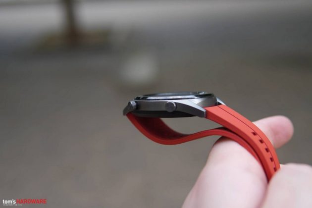 I materiali costruttivi scelti per il Watch GT Active sono di buon livello: la cassa da 46 mm è realizzata in acciaio inossidabile con la base in policarbonato, mentre la ghiera è in ceramica e il cinturino in fluoroelastomero, un materiale elastico e flessibile con una trama “zigrinata” che evita un’eccessiva aderenza con la pelle. Il modello di prova era di colore arancione, sono disponibili anche le varianti Dark Green, White e Black. Il cinturino si stacca per la pulizia e per l’eventuale sostituzione.