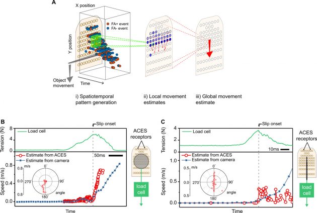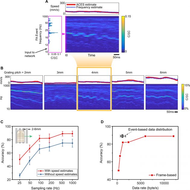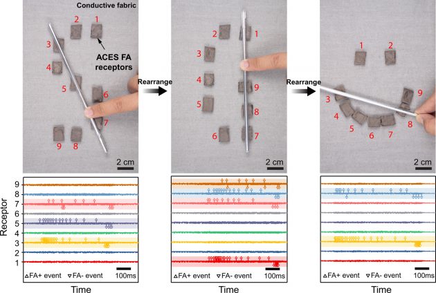 Il suo segreto è che può inviare segnali 1000 volte più velocemente del sistema nervoso umano. Le pelli elettroniche sensibili al tatto che sono state sviluppate finora trasmettono le informazioni tattili tramite sensori in serie. Una tecnica che crea “colli di bottiglia”, ossia che rallenta la lettura dei dati e quindi la percezione. Al crescere del numero dei sensori, aumentano i rallentamenti, quindi cala l’efficienza. ACES, al contrario, sfrutta un’architettura neuromimetica (che imita artificialmente quella neurologica reale) che consente la trasmissione simultanea di informazioni termotattili mantenendo latenze di lettura eccezionalmente basse, anche con set di dati provenienti da 10.000 sensori.