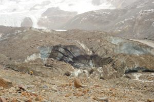 La fronte del ghiacciaio dei Forni coperta di detriti