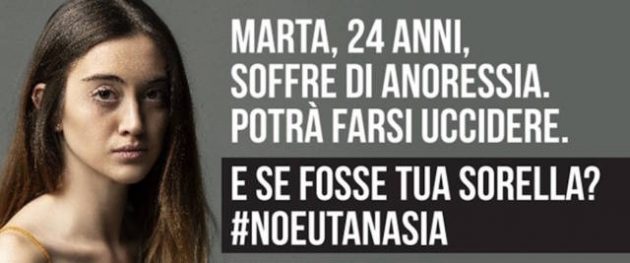 I manifesti – “Marta, 24 anni, anoressica, potrà farsi uccidere. E se fosse tua sorella?”. E poi: “Alessandro, 18 anni, bullizzato. Potrà farsi uccidere. E se fosse tuo figlio?”. Infine “Maria, 70 anni, ha un tumore. Potrà farsi uccidere. E se fosse tua nonna?” e “Lucia, 45 anni, disabile. Potrà farsi uccidere. E se fosse tua mamma? #Noeutanasia”. Sono le scritte che compaiono sopra i manifesti di ProVita contro l’eutanasia e il suicidio assistito. Una “pratica” che “come ha detto il Papa” si “‘basa su una visione utilitaristica della persona che diventa inutile o può essere equiparata a un costo. Il suicidio assistito quindi rappresenterebbe un pericolo per tutti: le nostre nonne, le nostre mamme, i nostri padri e i nostri figlì”, hanno dichiarato Antonio Brandi e Jacopo Coghe, presidente e vice presidente di ProVita e Famiglia e del Congresso Mondiale delle Famiglie, che hanno lanciato anche un video contro le “derive possibili in caso di fine vita autorizzato dallo Stato, perché noi vogliamo eliminare la sofferenza e non il sofferente”.
