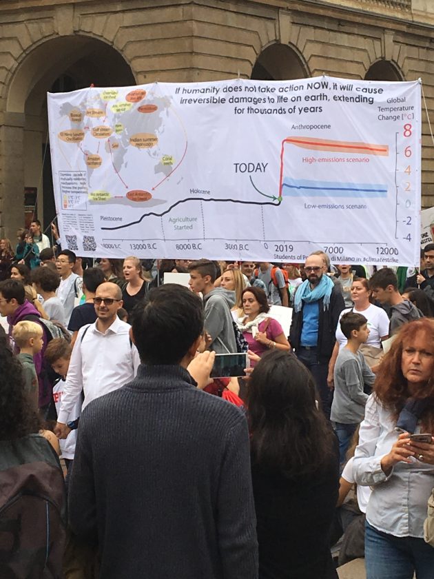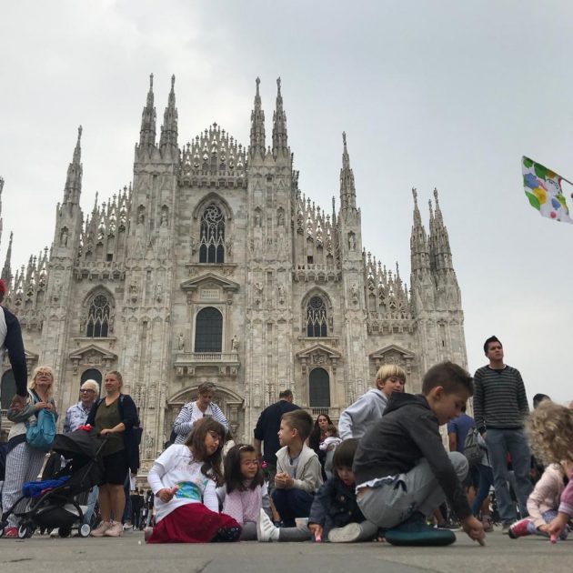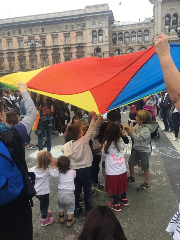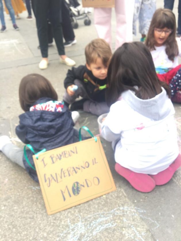 Ed è proprio qui che i piccoli dell’asilo nido La Giocomotiva, insieme a quelli dell’associazione ‘Bambini e Natura’ hanno potuto, seguiti da mamme e papà, raggiungere educatrici ed educatori. Appuntamento già alle 10, ai piedi del monumento a Vittorio Emanuele II. E ce l’hanno fatta, nonostante lo sciopero dei mezzi Atm. Tanta emozione, per qualche bambino è stata comprensibilmente la prima volta, altri sono già veterani dello sciopero del venerdì. Circondati da migliaia di persone, molti giovanissimi come quella Greta, la biondina, che mamma e papà hanno visto alla tv. Mentre un gruppo di ragazzi, in attesa del corteo, ha intonato cori e mostrato striscioni chiedendo più attenzione per l’ambiente e ricordando che “non c’è un planet B”, i bambini hanno sventolato piccole bandiere preparate per l’occasione, disegnato fiori e animali con i gessetti e hanno fatto il girotondo intonando “salviamo la terra, salviamo la terra, tutti giù per terra”. Per loro è stata una festa. Ed è giusto sia così. Poi hanno raggiunto il corteo che, nel frattempo, è arrivato all’altezza di Piazza della Scala. Un tappeto di striscioni salutato con le piccole bandierine sventolanti. Da un lato gli adolescenti, pieni di domande e di accuse (“chissà come mai, i soldi per l’ambiente non ci sono mai”), dall’altro la leggerezza dell’infanzia.