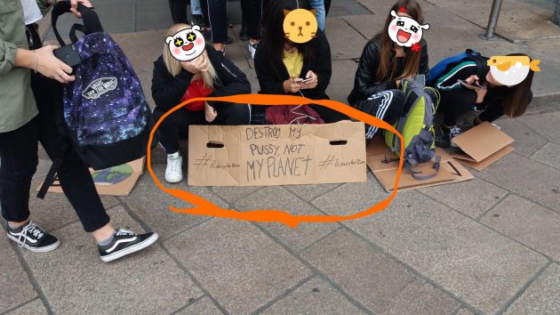 Attenzione: messaggi come questi non costituiscono la maggioranza dei contenuti nelle manifestazioni di Friday for future. Sono però convinta che non si debbano sottovalutare mai il sessismo e la misoginia delle parole d’ordine dei movimenti (pur se minoritaria, mi auguro) e il loro immaginario quando si tratta di sessualità e relazioni tra i sessi, a maggior ragione se emergono nel mondo giovanile.