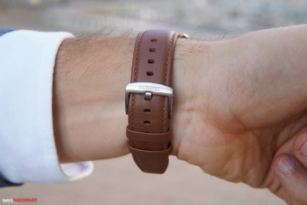 Huawei Watch GT 2 ha le sembianze di un orologio da polso classico. La versione di prova è la Pebble Brown con cassa da 46 mm e cinturino in pelle marrone. Le lettrici farebbero bene a dare un’occhiata alla variante da 42 mm, che peraltro ha anche un design leggermente diverso con forme più arrotondate. A prescindere da questo, Watch 2 non è uno smartwatch compatto: ha uno spessore di 10,7 millimetri e pesa 41 grammi. La versione femminile pesa 29 grammi. Quando lo si indossa il peso si fa sentire, anche se non ci è sembrato scomodo. Una volta abituatisi alle dimensioni, diventa un buon compagno della routine quotidiana.