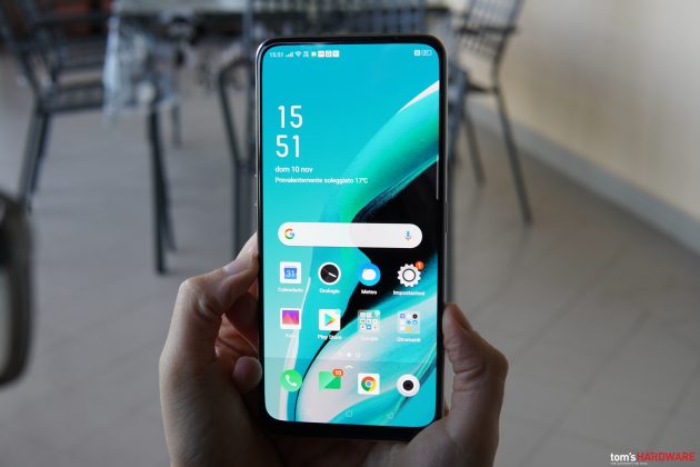 Lo smartphone non risulta particolarmente ergonomico, in quanto tende a scivolare e le dimensioni sono importanti (pesa ben 195 grammi, iPhone 11 Pro ne pesa 188). È inclusa in confezione l’elegante cover in pelle che però non riprende la colorazione del dispositivo, come invece succede per Reno2. Frontalmente domina un bel display AMOLED da 6,5 pollici con risoluzione Full-HD+ (2.400 x 1.080 pixel). Le considerazioni sono le stesse fatte per il modello principale, dato che parliamo dello stesso pannello. Dunque, ottimi angoli di visuale, buona visibilità all’aperto, elevata luminosità massima al netto di una non molto precisa gestione della luminosità automatica.