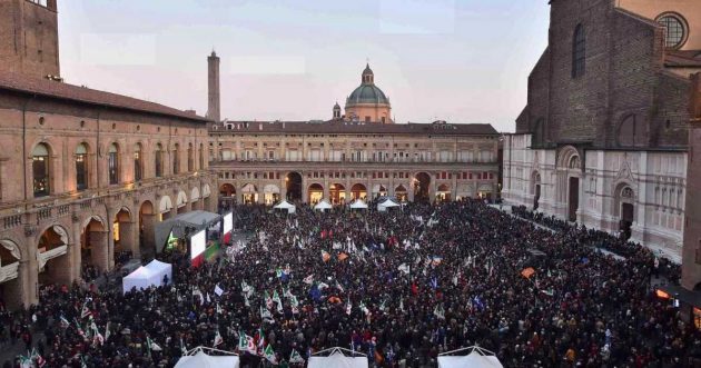 Bologna, Bonaccini in piazza senza big del Pd: ‘Almeno 10mila’. Tra la folla Prodi e Santori. Al M5s: “Davvero noi e la destra siamo uguali?”