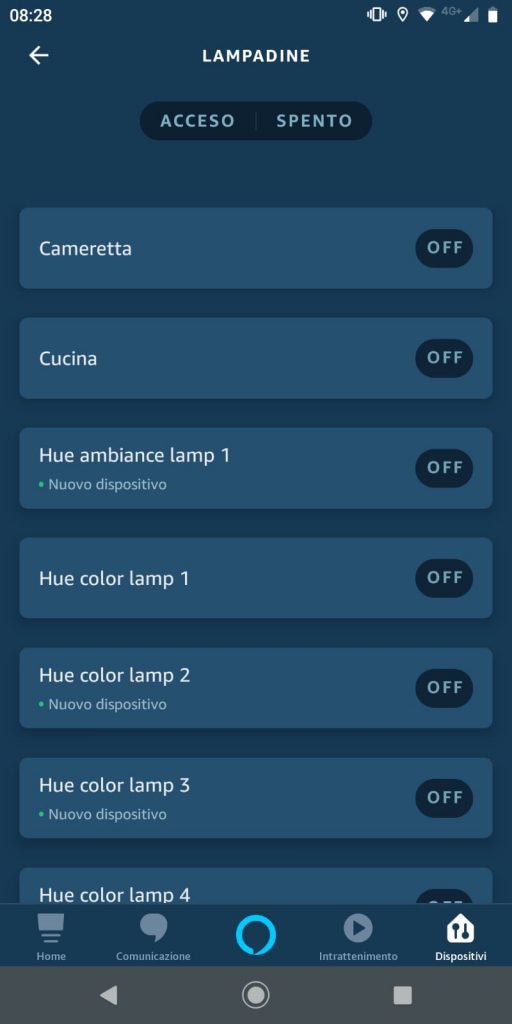 Come ogni dispositivo smart che si rispetti, anche le lampadine Philips Hue possono essere utilizzate mediante controllo vocale, ad esempio durante la nostra prova abbiamo scelto di utilizzarle tramite Alexa, l’assistente vocale di Amazon, e per farlo abbiamo dovuto semplicemente attivare la skill “Hue” dall’app di Alexa, collegarla all’account Hue e collegare al bridge. Una volta completato questi passaggi è stato possibile gestire le lampade smart con comandi semplici come “Alexa accendi/spegni le luci del salotto” o “Alexa imposta luci salotto al 50%”, “Alexa luci camera verde” per regolare rispettivamente luminosità e colore.
