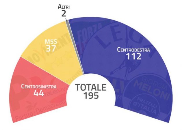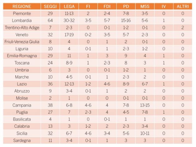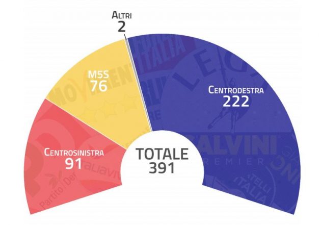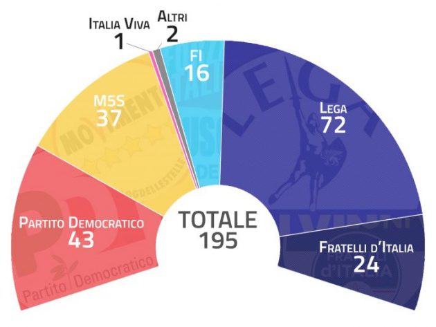 Al Senato la situazione sarebbe molto simile. La Lega dispone di 72 senatori, sommati ai 24 di Fratelli d’Italia e ai 16 berlusconiani: anche in questo, per superare quota 100, serve Fi che porta la coalizione di centrodestra a 112 seggi. Il Pd ne ha 42, mentre la Svp con i due seggi dell’Alto Adige è addirittura più numerosa dei renziani che eleggono un senatore appena, in Lombardia. I senatori Cinquestelle sono solo 37. Il Carroccio è l’unico partito che elegge almeno un senatore in ogni Regione.