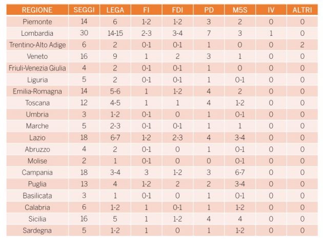 La simulazione tiene conto anche del taglio del numero dei parlamentari, ridotti a 600 dalla riforma costituzionale che però sarà sottoposta a referendum, ma non include gli eletti in Valle d’Aosta e all’Estero, escludendo quindi dal calcolo 9 deputati e 5 senatori in tutto. Il Parlamento che ne esce è ovviamente a trazione centrodestra, per non dire sovranista: il motivo sta nel consenso elettorale stimato dai sondaggi, che anche oggi assegnano a Lega e Fdi un numero di voti ampiamente superiore al 40 per cento. Con questi numeri, qualsiasi sistema elettorale assegnerebbe loro la maggioranza. Il Germanicum, ovvero un proporzionale puro che dal sistema tedesco prende solo la soglia di sbarramento fissata al 5%, mitiga questo strapotere rispetto all’attuale sistema, il Rosatellum. Non a caso proprio i partiti di Matteo Salvini e Giorgia Meloni chiedono un sistema maggioritario, per via della forza della coalizione di centrodestra. Forza Italia invece rimane più cauta, anche perché – come mostra la simulazione – questo sistema potrebbe darle più margine negoziale.