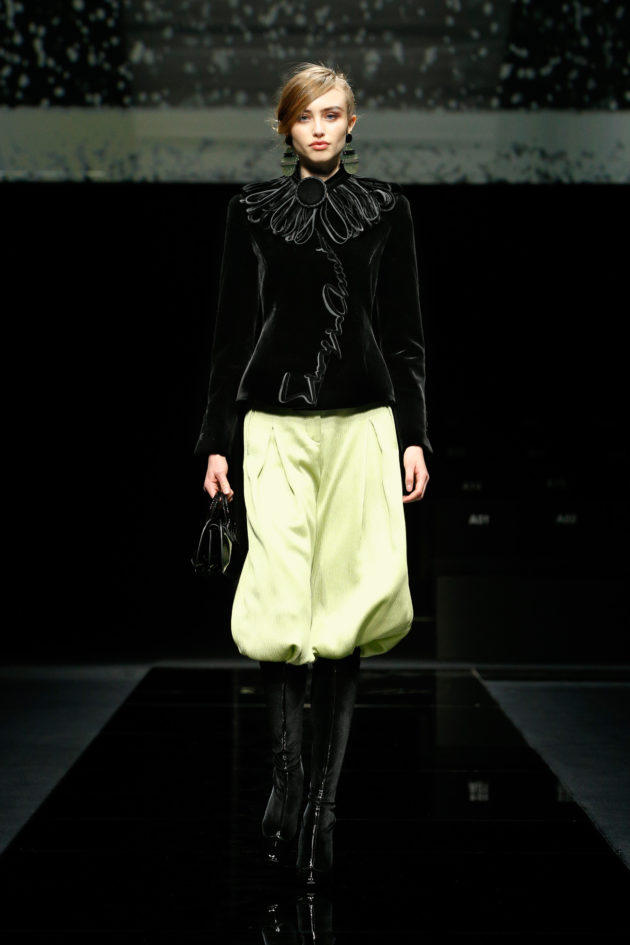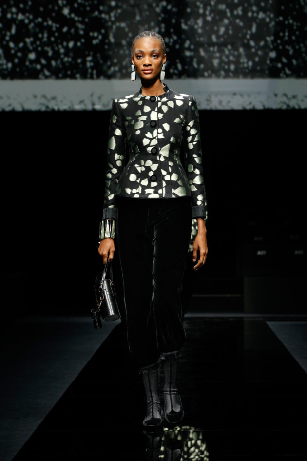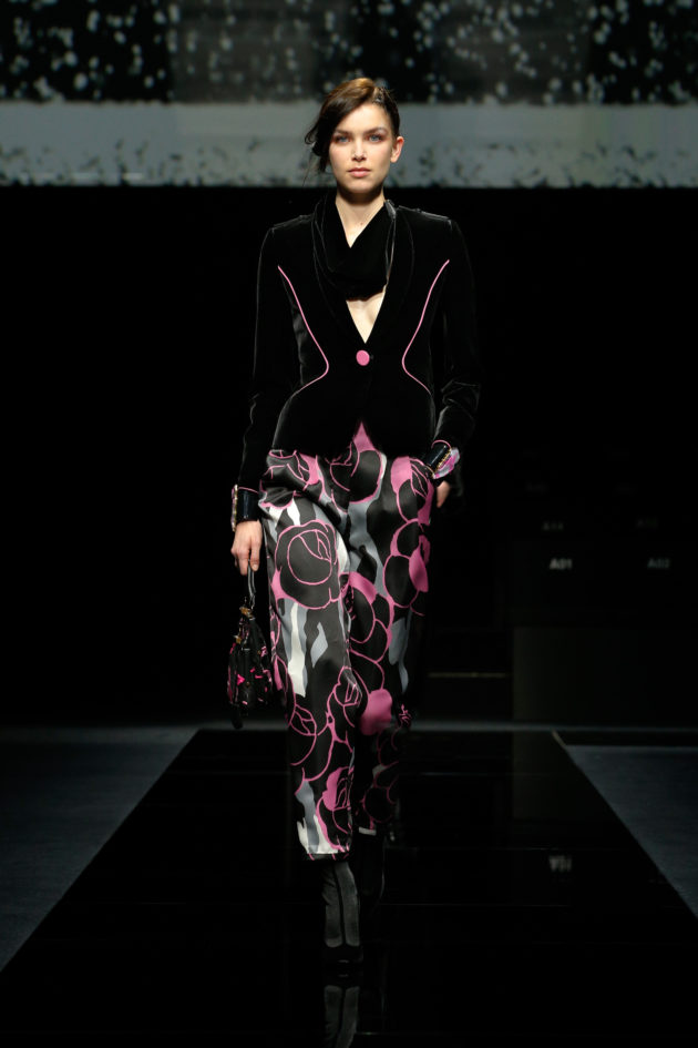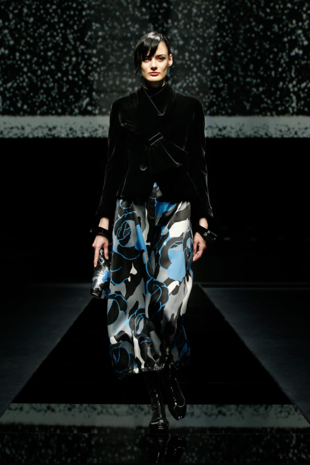 Adora la bellezza Luisa Beccaria e nella serra del Lubar, il ristorante di famiglia, sbocciano sovrapposizioni di chiffon e sete fiorate, giacche in bouclé jacquard a grano di riso, vestiti chemisier da portare aperti e scivolati su pantaloni a sigaretta. Luisa gioca con la luce tra i cristalli della serra che si riflettono sugli abiti da sera impreziositi da pagliuzze d’oro e d’argento. Cura dell’accessorio e fiori d’inverno anche su stivali e stivaletti coperti con i tessuti della collezione e sulle calze coprenti interamente stampate.