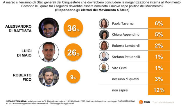 Alessandro Di Battista sarebbe il capo politico M5s ideale per il 36 per cento degli elettori grillini. Per il 26% dovrebbe essere invece il dimissionario Luigi Di Maio. A seguire Roberto Fico (9%), Paola Taverna (6%), Chiara Appendino (5%). L’attuale “reggente” Vito Crimi è preferito solo dall’1% del campione. Secondo la rilevazione dell’istituto Swg sono questi i consensi raccolti dai principali esponenti 5 stelle all’interno del loro elettorato. Un sondaggio che arriva proprio in una fase molto delicata dentro il M5s, quando si attende che venga fissata la data degli Stati generali per eleggere la nuova guida.