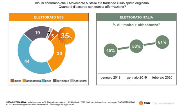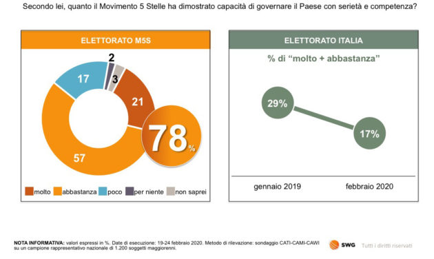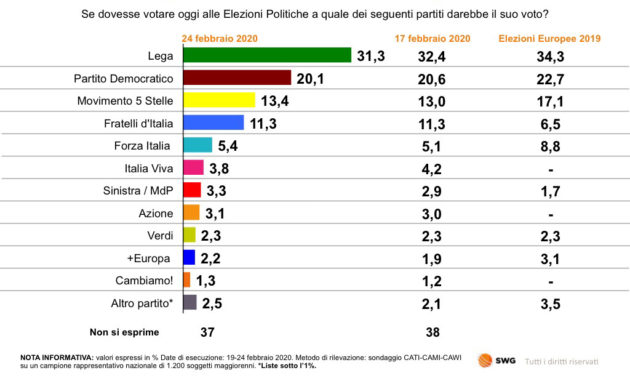 Per quanto riguarda infine i consensi dei singoli partiti, sempre secondo Swg, nella settimana caratterizzata dagli scontri interni alla maggioranza e dallo scoppio dell’emergenza coronavirus, la Lega di Matteo Salvini perde un punto e si attesta al 31,3 dal 32,4%. Scende leggermente il Pd che arriva al 20,1 dal 20,6%; sale il Movimento 5 stelle al 13,4 dal 13. Scende Italia viva dal 4,2 al 3,8 %. Stabile Fdi all’11,3. Nel Centrodestra, Forza Italia risale al 5,4 dal 5,1 per cento.