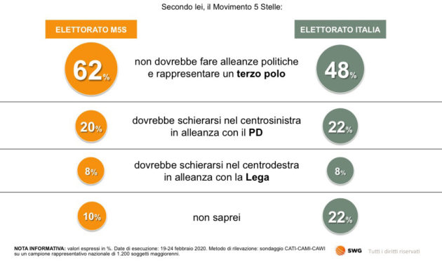 La stragrande maggioranza degli elettori del M5s boccia inoltre, le alleanze politiche e propende per un Movimento che si collochi come terzo polo. Alla domanda su come il M5s dovrebbe schierarsi rispetto alle altre forze politiche, il 62% dell’elettorato M5s ha risposto che “non dovrebbe fare alleanze politiche” e rappresentare invece un “terzo polo”. La stessa posizione ha ricevuto il consenso del 48% dell’elettorato italiano. Il Movimento, invece, “dovrebbe schierarsi nel centrosinistra in alleanza con il Pd” per il 20% dell’elettorato pentastellato e per il 22% dell’elettorato generale. Stessa percentuale di elettorato M5s e generale indica invece l’opzione di schierarsi con il centrodestra, in alleanza con la Lega: l’8% per entrambi. Non si esprime invece il 10% degli elettori M5s e il 22% dell’elettorato italiano.