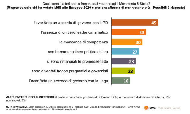 Il sondaggio si è poi focalizzato su chi dichiara di aver votato i 5 stelle alle Europee e ora dice di non volerli più votare. Alla domanda su quali siano “i fattori che la frenano dal votare oggi il Movimento 5 Stelle” il 45% degli ex elettori ha risposto “l’aver fatto un accordo di governo con il Pd” mentre solo il 18% delle risposte indica “l’aver fatto un accordo di governo con la Lega“. Il 33% delle risposte evidenzia invece “l’assenza di un vero leader carismatico” mentre il 30% indica “la mancanza di competenza”. Pari merito al 23% le risposte: “Si sono mangiati le promesse fatte” e “sono diventati troppo pragmatici e governisti”. Altri fattori con percentuali inferiori indicano infine “il modo in cui stanno governando il Paese”, votato dal 17%; “la mancanza di democrazia interna” per il 5%; “non saprei”, per il 5%.