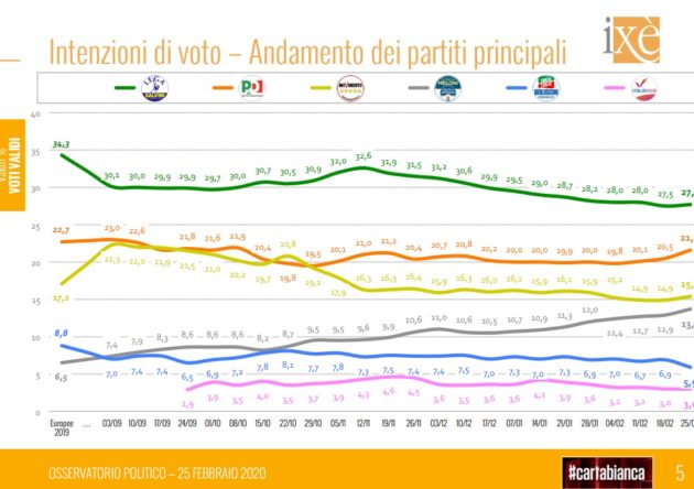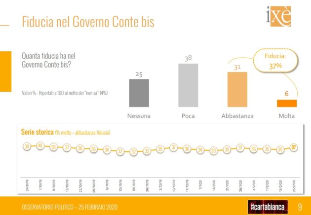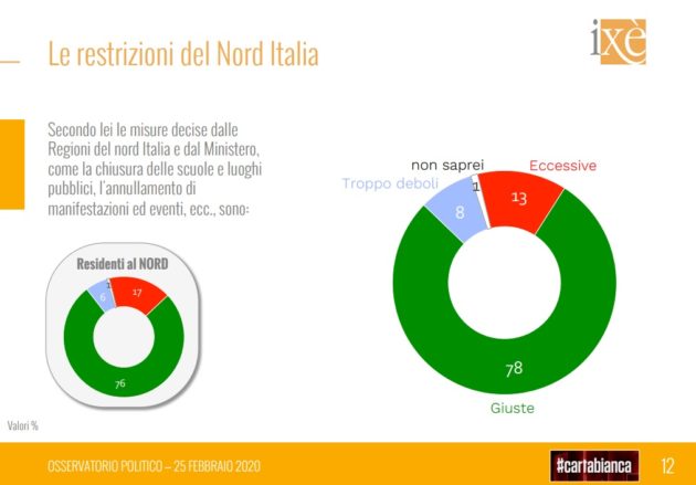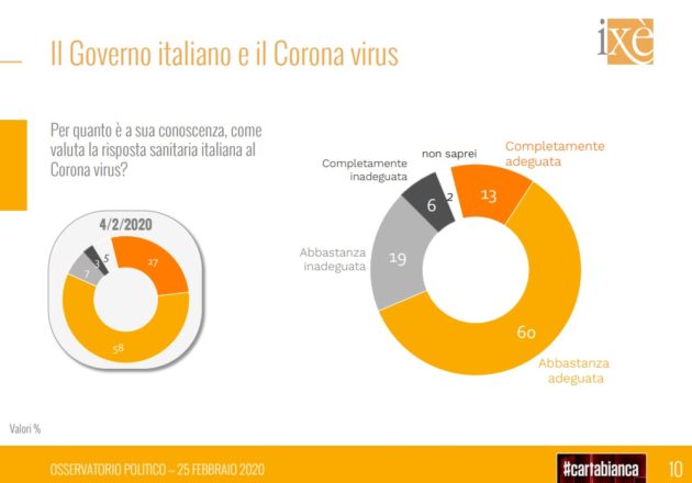 Si ferma il calo del Carroccio, salgono Pd e in misura minore il M5s. Cresce la fiducia in Giuseppe Conte e, cambiando argomento, la stragrande maggioranza degli italiani crede che le misure adottate dal governo e dalle regioni del Nord contro il coronavirus siano giuste. È quanto emerge da un sondaggio Ixè per la trasmissione Carta Bianca in onda sui Rai3. Politica, partiti, governo e gli effetti del virus, quindi, nelle domande rivolte agli italiani. Che sembrano avere le idee molto chiare sulla diffusione della malattia che in questi giorni ha bloccato il Nord Italia.