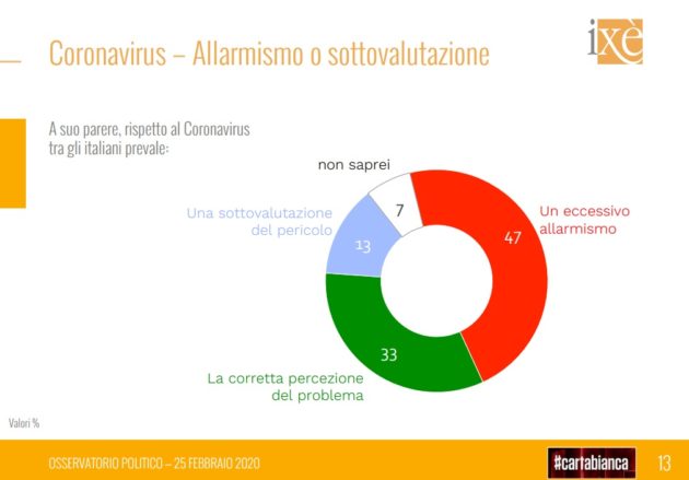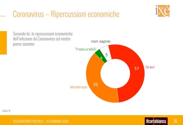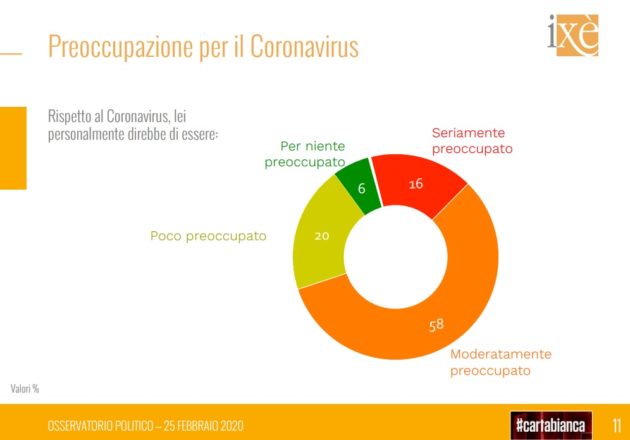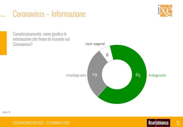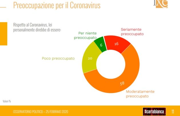 Nella fattispecie, il 65% del campione ha sottolineato che le informazioni ricevute sul coronavirus sono adeguate, mentre il 29% pensa che siano inadeguate. La maggior parte degli intervistati (52%) è convinto che le ripercussioni economiche sul nostro Paese saranno gravi, contro il 39% che pronostica effetti moderati (trascurabili per il 4%). Per il 47% degli intervistati, inoltre, c’è un eccessivo allarmismo tra gli italiani, mentre il 33% pensa che la percezione del problema sia corretta e il 13% è convinto che ci sia stata una sottovalutazione del pericolo. Per il 78%, invece, le restrizioni adottate dalle regioni e dal governo sono adeguate, contro il 13% che pensa siano eccessive e l’8% che le valuta troppo deboli. Il 58%, poi, dice di essere moderatamente preoccupato rispetto al coronavirus, il 20% poco preoccupato, il 16% seriamente preoccupato, il 6% per niente preoccupato. Per quanto riguarda la risposta sanitaria italiana al problema, il 60% dice che è abbastanza adeguata, il 19% abbastanza inadeguata, il 13% completamente adeguata e il 6% completamente inadeguata.