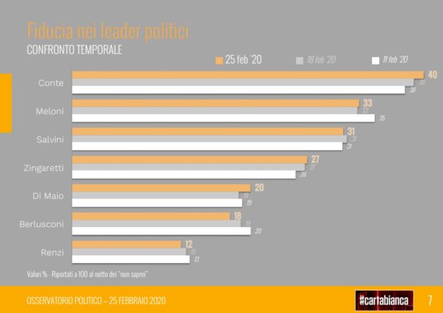 Per quanto riguarda i partiti e la politica, invece, si ferma il calo del Carroccio che durava da dodici settimana: si attesta al 27,7 dal 27,5% e sei punti avanti al Partito democratico. Crescono i principali partiti di maggioranza con il Pd che sale di un punto dal 20,5% al 21,6 e il Movimento 5 Stelle al 15,4 dal 14,9 mentre Iv resta stabile al al 3. Fdi cresce ancora al 13,7 dal 12,9 mentre cala Fi dal 6,9 al 5,9. Per quanto riguarda la fiducia nei leader politici, aumenta di poco quella nei confronti del premier Giuseppe Conte, che in una settimana passa dal 39 al 40%, con trend positivo da tre settimane a questa parte. Stabili Meloni (33%), Salvini (31%), Zingaretti (27%), il leggero aumento Di Maio (20% dal 19% di una settimana fa) e il calo Berlusconi (18%, meno uno rispetto al 18 febbraio) e Renzi (12% contro il 13 della scorsa settimana). Cresce di due punti (37% contro 35%), infine, la fiducia degli italiani nei confronti del governo Conte 2.