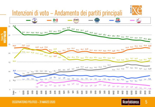 Per quanto riguarda i singoli partiti, Ixè segnala, nella compagine di governo, la crescita in termini di consenso del Movimento 5 stelle (15,6% dal 15,1) e la Sinistra (3,9% dal 3,5). Cala leggermente il Pd (22,6% dal 22,9) e perde ancora sostegni Italia viva passando all’1,9 dal 2,2 per cento. Sul fronte dell’opposizione, prosegue l’erosione della Lega (26,2% dal 26,5), mentre salgono Forza Italia (7,4% dal 7) e Fratelli d’Italia (12,8% dal 12,7), lasciando il centro destra sostanzialmente stabile al 46%.