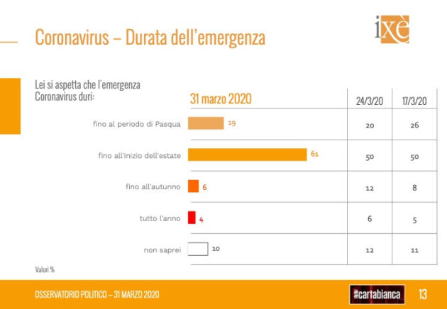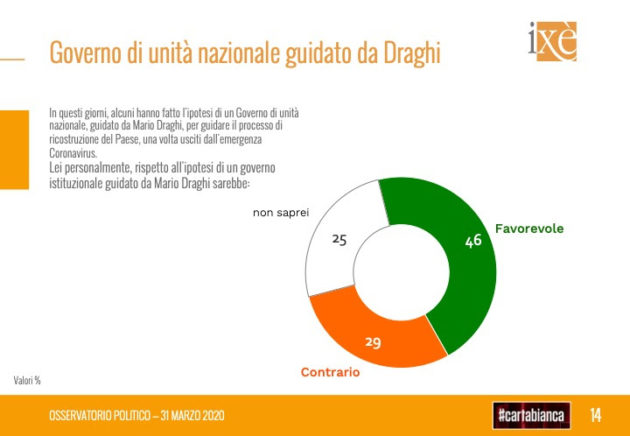 Sul tema emergenza coronavirus infine, il 61 per cento degli intervistati ritiene che l’emergenza duri fino all’inizio dell’estate. Solo il 19 per cento ritiene che si esaurirà dopo Pasqua. Sulla ricostruzione inoltre, il 46% delle persone interpellate da Ixè si è detto favorevole che a guidare il processo di ricostruzione post-emergenza sia un governo guidato dall’ex presidente della Bce Mario Draghi, un’ipotesi questa avanzata da alcuni esponenti dell’opposizione, ma al momento priva di alcun fondamento.